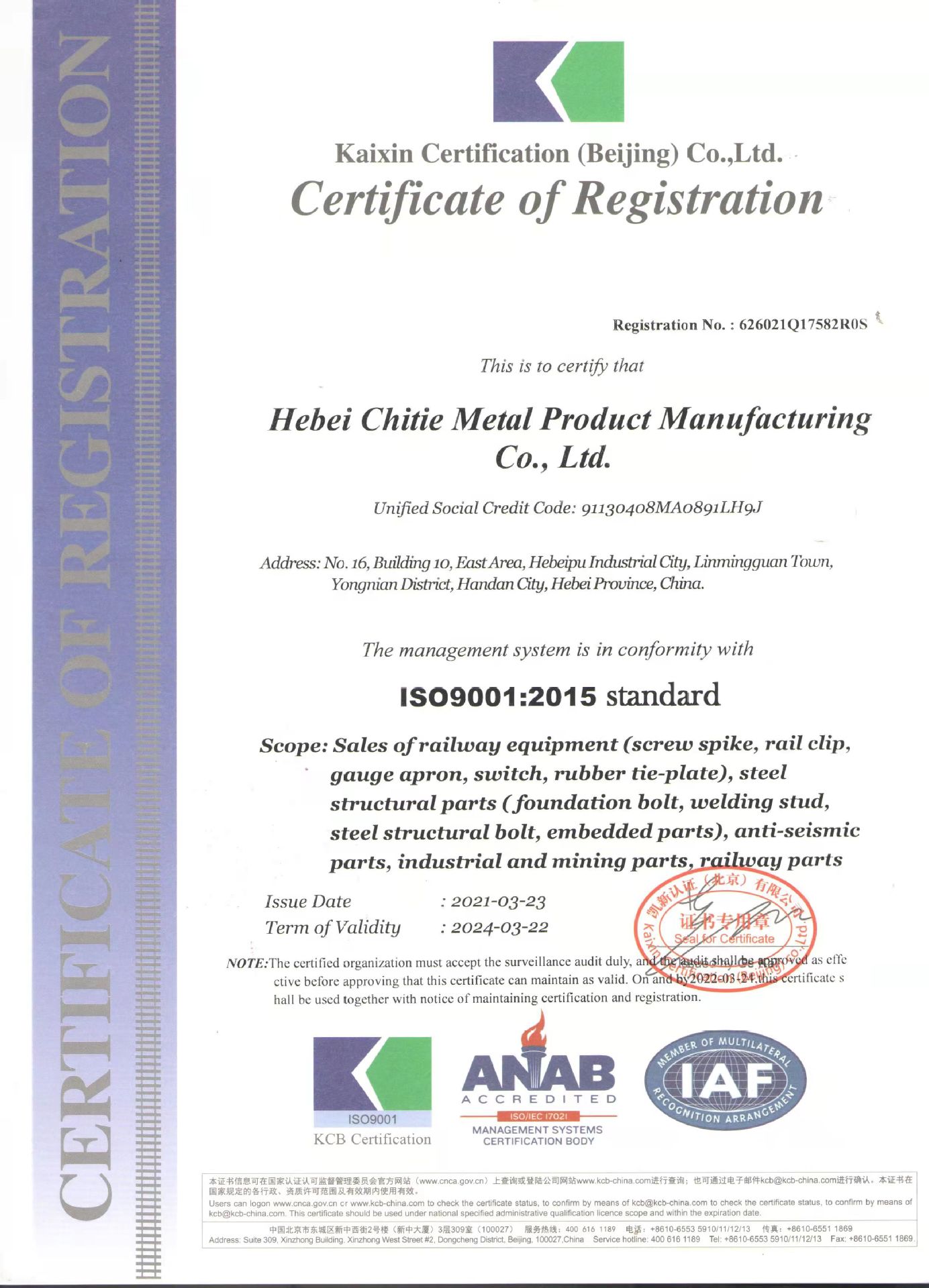主要產(chǎn)品:鐵路配件、行車(chē)配件、工礦配件、魚(yú)尾板、道釘、壓軌器、軌道壓板、軌距拉桿、護(hù)軌扣板、T型螺栓、魚(yú)尾螺栓、彈條、軌距擋板